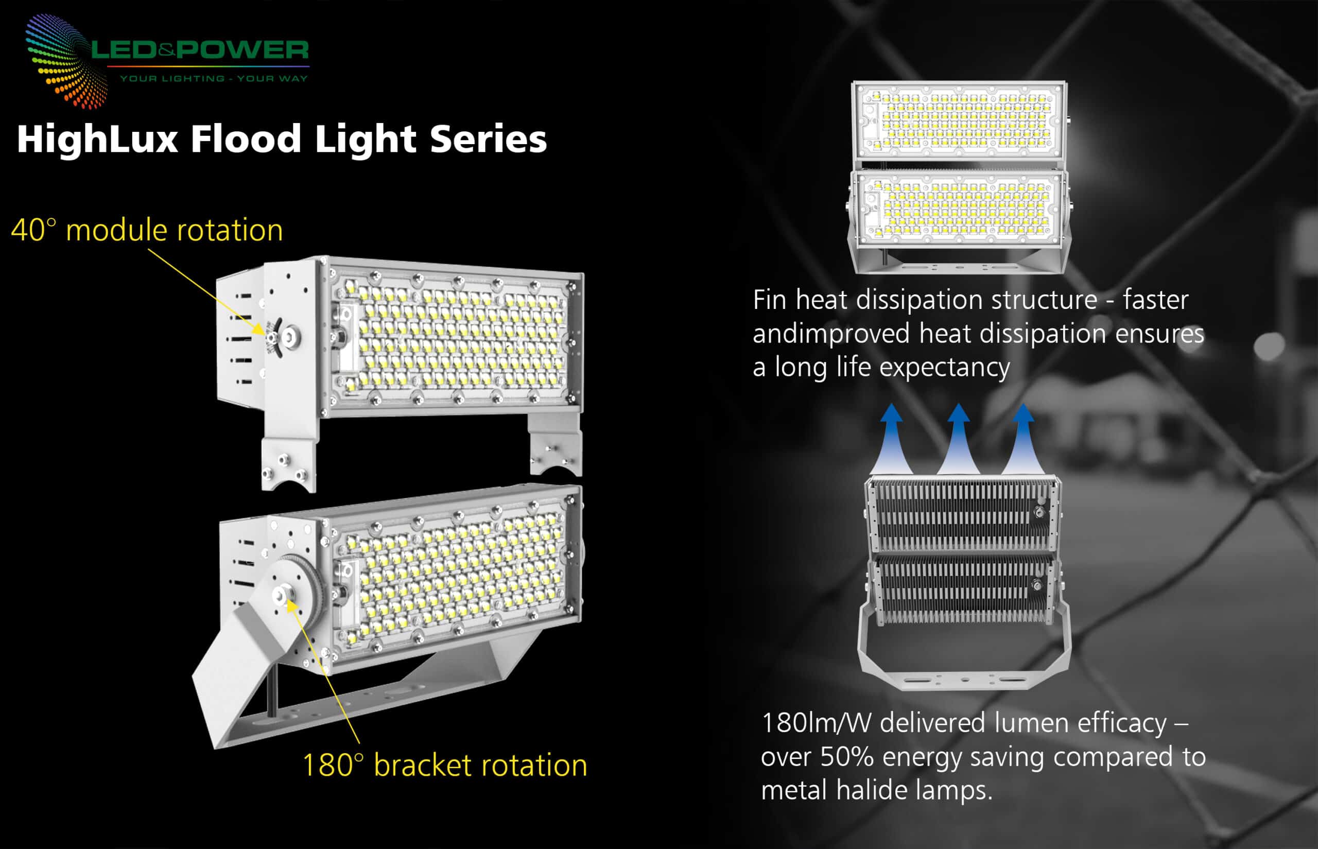 Due to the luminaires high efficacy of 180lm/W and high power of 500W, the 500W LED Floodlight 5000K 180lm/W 60° IP65 OSRAM LED Inventronics Driver Sports Lighting is a suitable and smart choice for indoor and outdoor sports areas. HighLux is not only limited to sports lighting applications, it is also suitable for high level lighting in exhibition halls, warehousing and general commercial and industrial external projects.